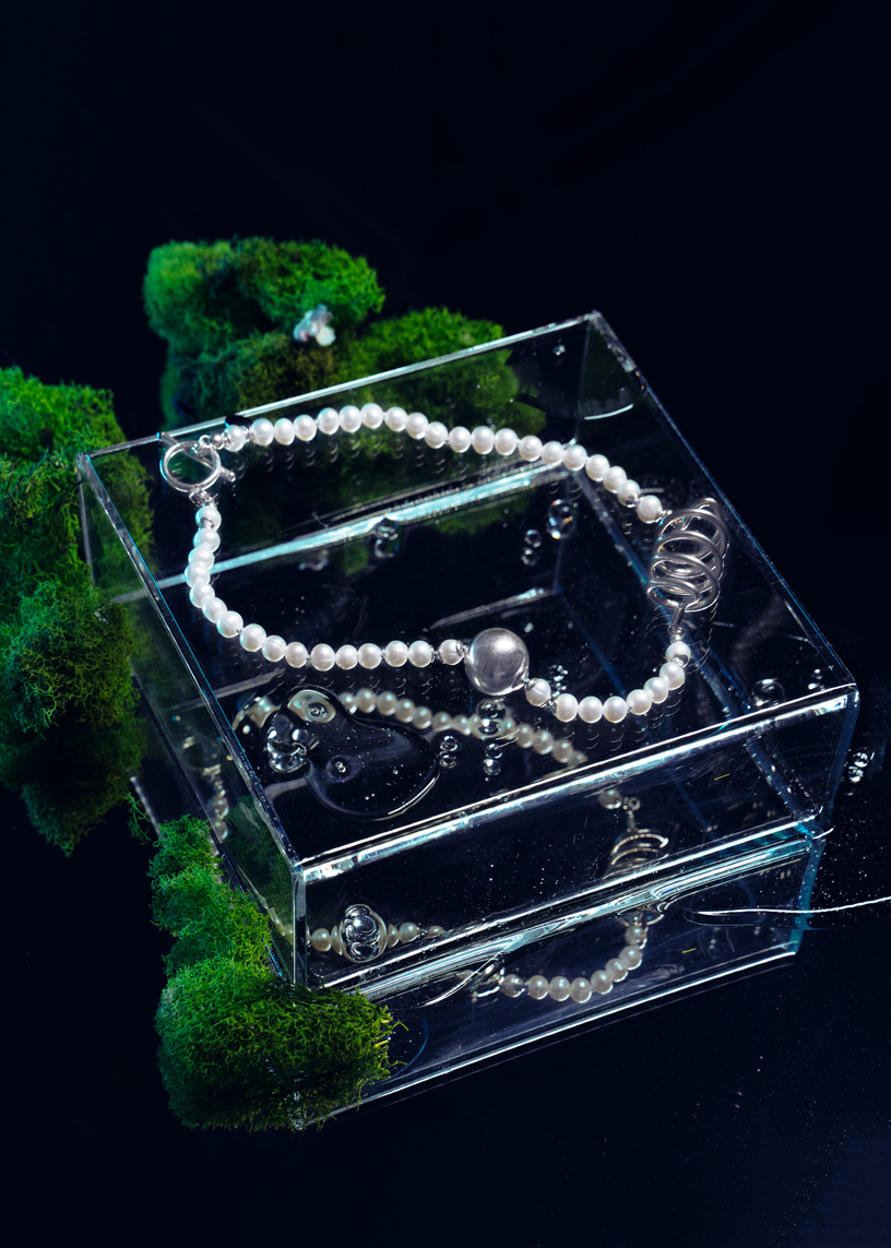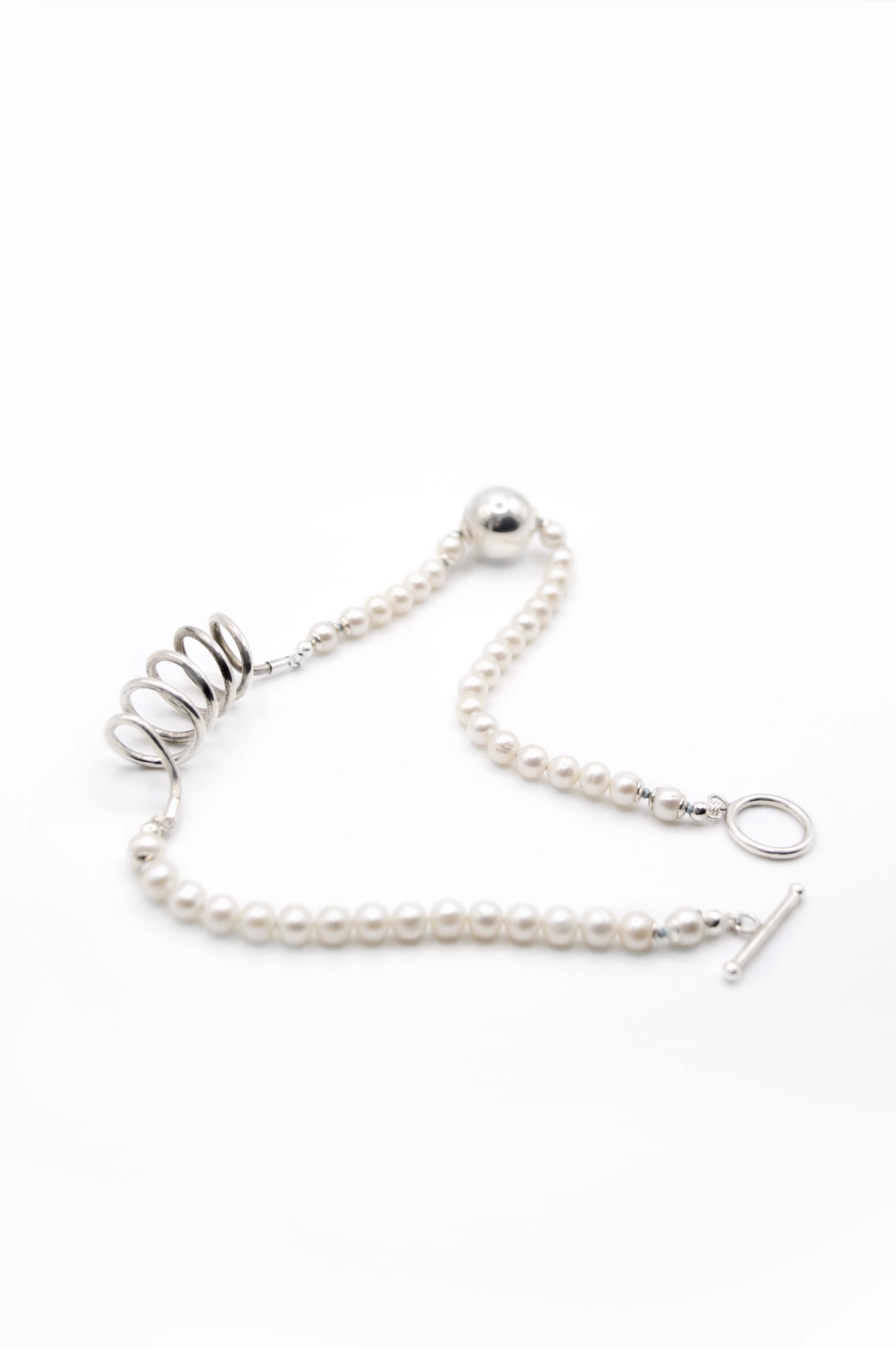 The Knick Knack Necklace is strung with freshwater pearls and handmade with 100% sterling silver details. Each coil is bent by hand and fitted to the chain.